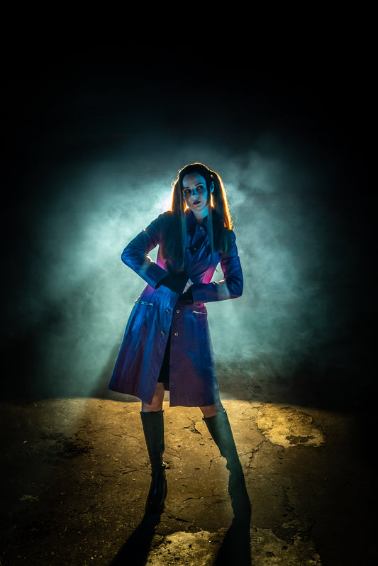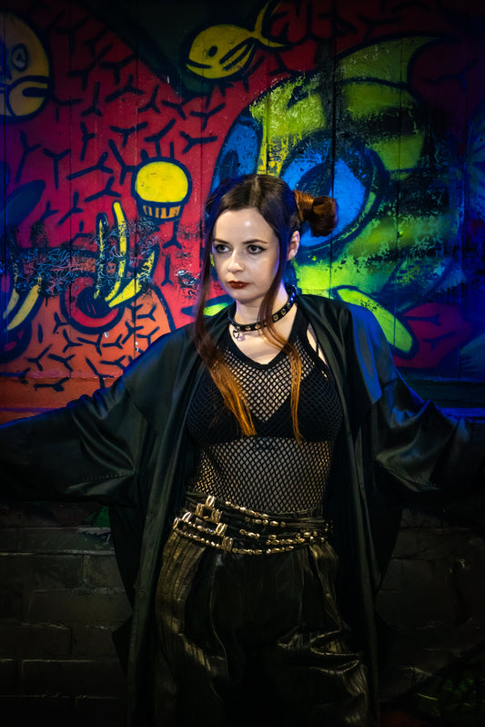 Each piece in this collection is carefully curated to capture the essence of a dystopian metropolis, where neon lights flicker through the rain, and the hum of technology intertwines with the raw, human spirit. Think leather jackets with a rebellious edge, oversized trench coats reminiscent of noir detectives, and sleek silhouettes that evoke a futuristic elegance. Textures and fabrics are thoughtfully chosen to reflect a world of contrasts—worn leather meets glossy vinyl, soft knits juxtapose against metallic sheens, and bold fabrics intersect with minimalist designs.