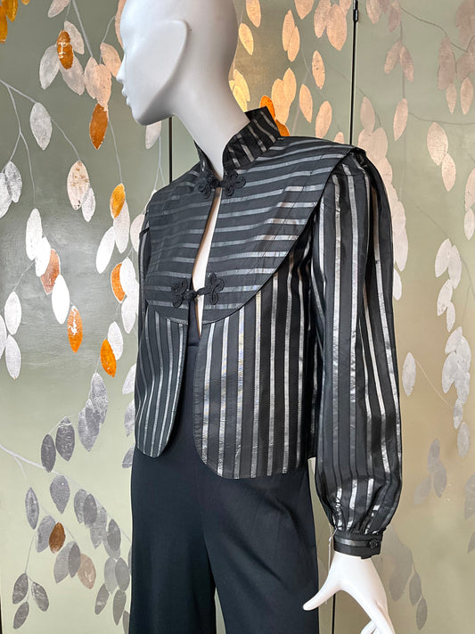 Vintage 1980s Black and Silver Stripe Puff Sleeve Taffeta Jacket, Medium