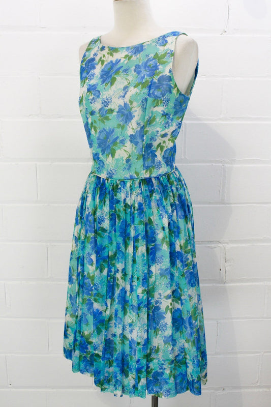 Vintage 1960s Jonathan Logan Blue Floral Print Chiffon Dress, XS
