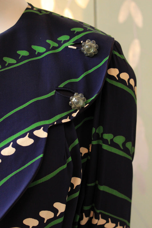 Vintage 1930s Blue And Green Asymmetrical Button Dress, Small