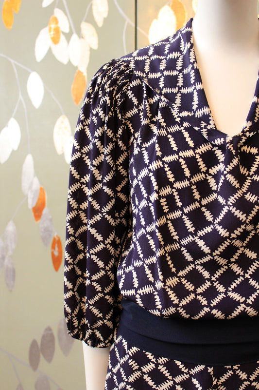 Vintage 1930s Geometric Print Blue And White Rayon Capelet Dress, XS