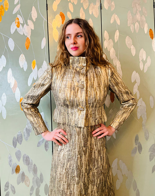 Vintage 60s Pauline Trigére Metallic Gold Lamé Cocktail Dress & Coat Set, B34