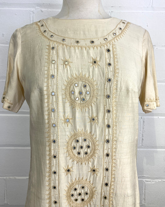 Vintage 1960s Ivory Silk Short-Sleeve Mirror Disc Embroidery Shift Dress, Large