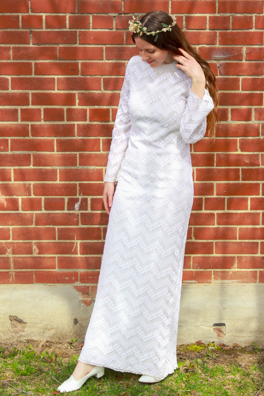 Vintage 1960s White Cotton Lace Long-Sleeve Sheath Maxi Dress, XS-S