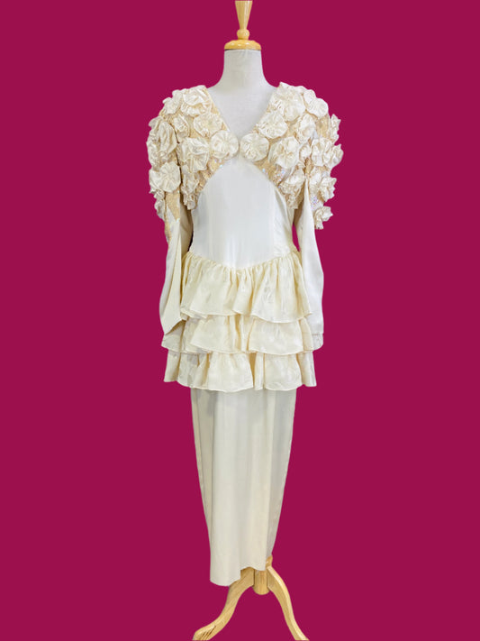 Vintage 80s Ivory Silk Tiered Skirt Wedding Gown with Rosette's, Doubles, Large