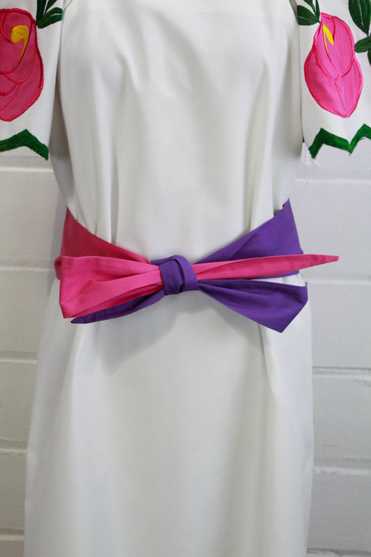 Vintage 1980s Albert Nipon White Linen Puff-Sleeve Embroidered Dress with Bow Belt, Small