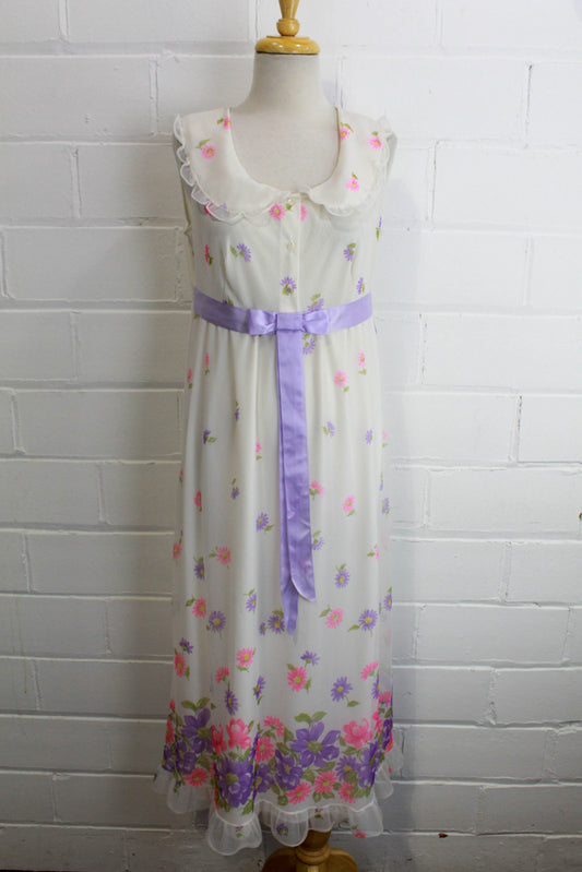Vintage 1960s/70s White Chiffon with Lilac and Pink Floral Print Maxi Dress, Med