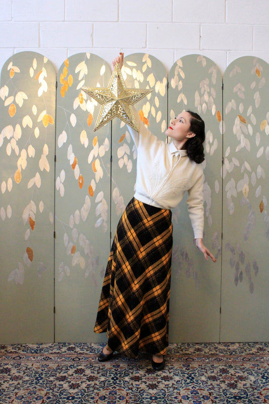 Vintage 1970s Black And Orange Plaid Maxi Skirt With Sparkles, S