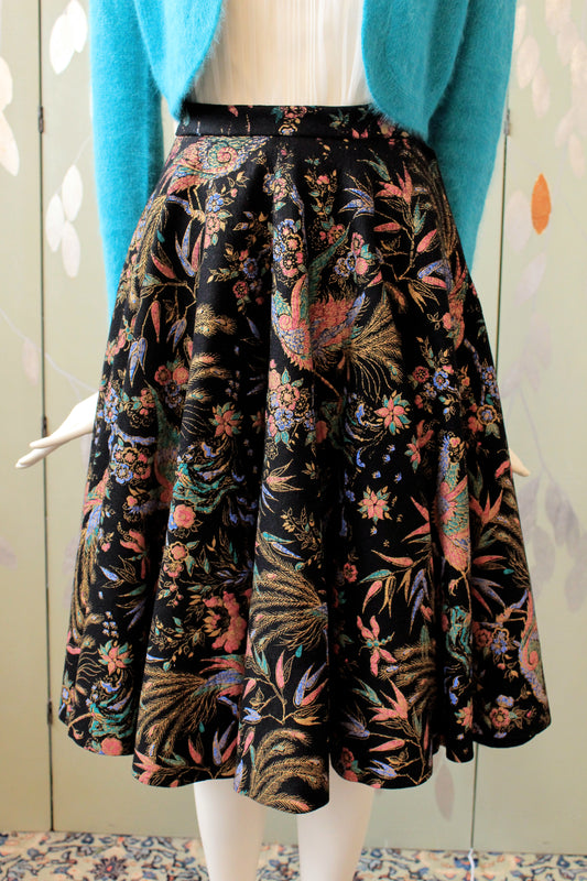 Vintage 1950s Felt Novelty Print Peacock Circle Skirt, Koret Of California, XS