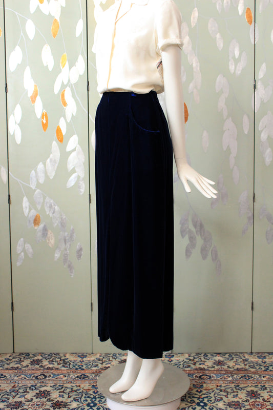 Vintage 1970s Royal Blue Velvet Midi Skirt With Front Slit, XS