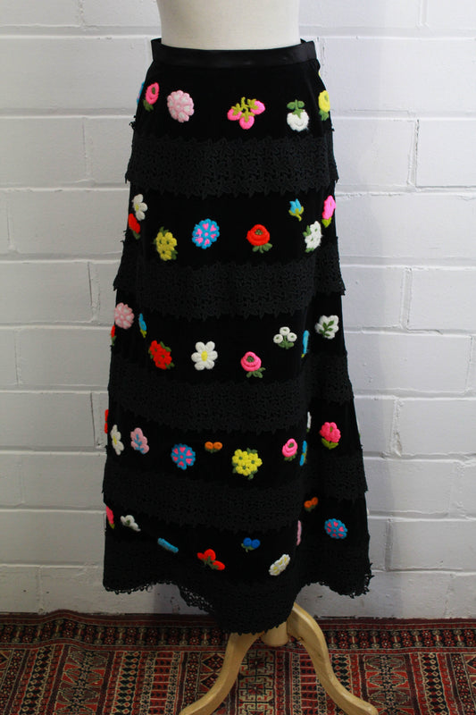 Vintage 1970s Black Velvet Flower Applique Maxi Skirt, Waist 26