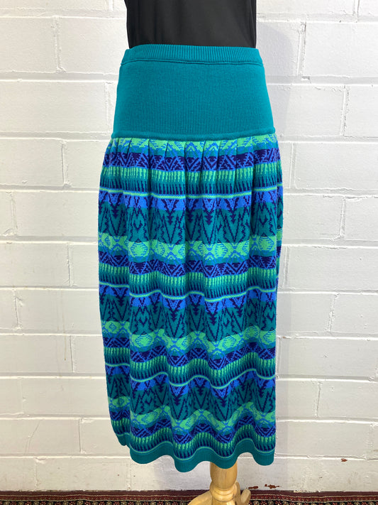 Vintage 1980s Rodier Teal Fair Isle Knit Dropwaist Midi Skirt, Medium