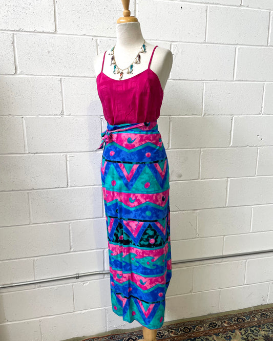 Vintage 1990s Blue Pink Abstract Print Wrap Skirt, Waist 30"