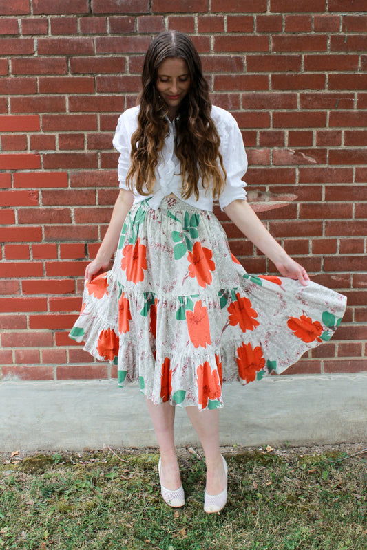 Vintage 1950s Orange Flower Print Cotton Skirt, Tiered Ruffle Skirt, Waist 25"