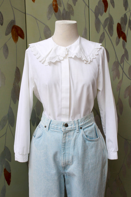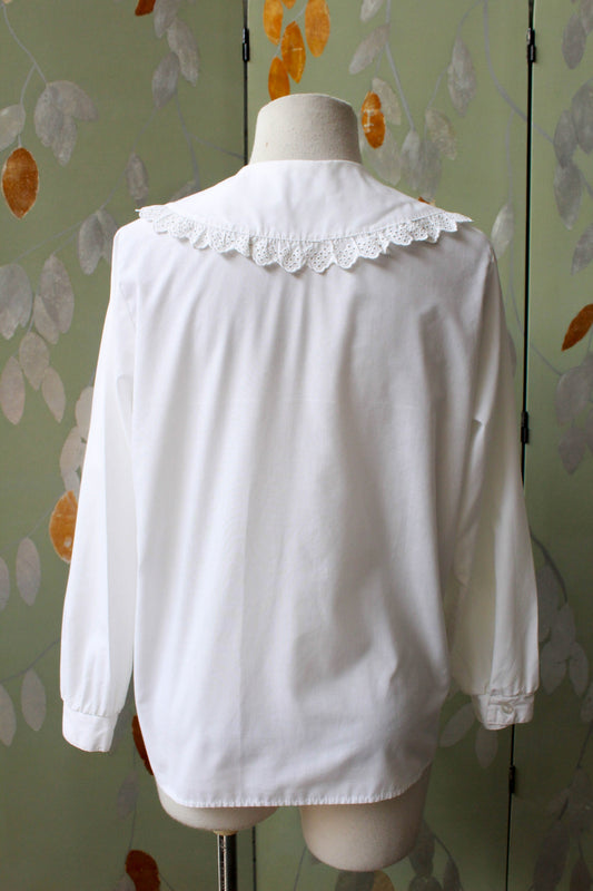 Vintage 1970s Sheer White Striped Wide Collar Lace Up Blouse, Medium