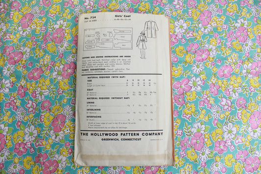 1930s or 40s Girls' Coat Sewing Pattern Hollywood 724, Complete, Bust 28"