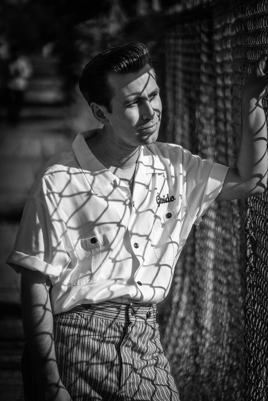 Vintage 1950s-Style Lucky Brand White Short Sleeve Bowling Shirt, XL