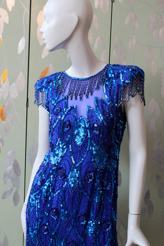 Vintage 1980s Blue Beaded Midnights Dress, XS