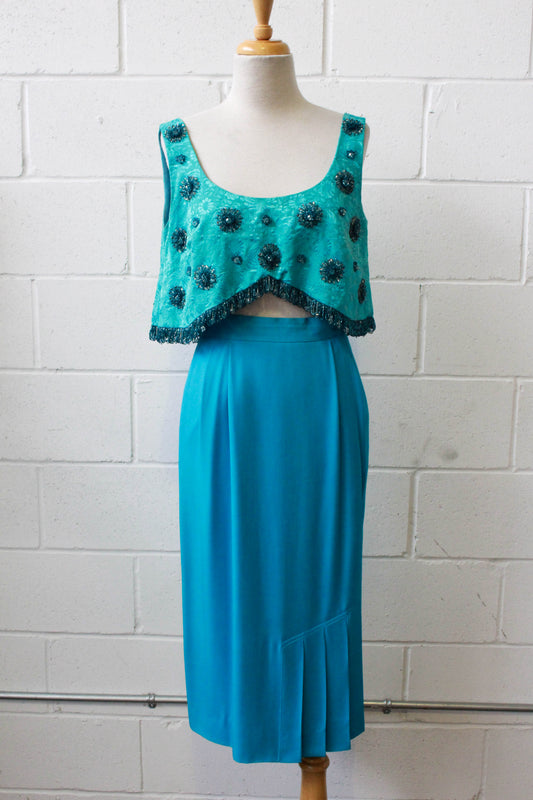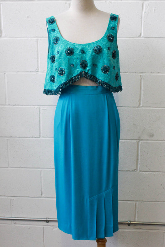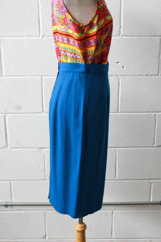 1980s Turquoise Pencil Skirt with Pleat Detail, Waist 26"
