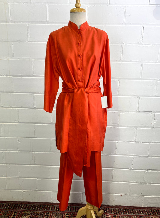 Vintage 1970s Orange Raw Silk Tunic & Pant Set with Sash Belt, W35"