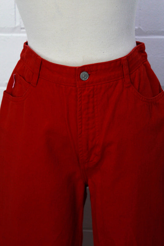Vintage 80s High-Waisted Red Denim Bongo Jeans, Tapered Leg, W28