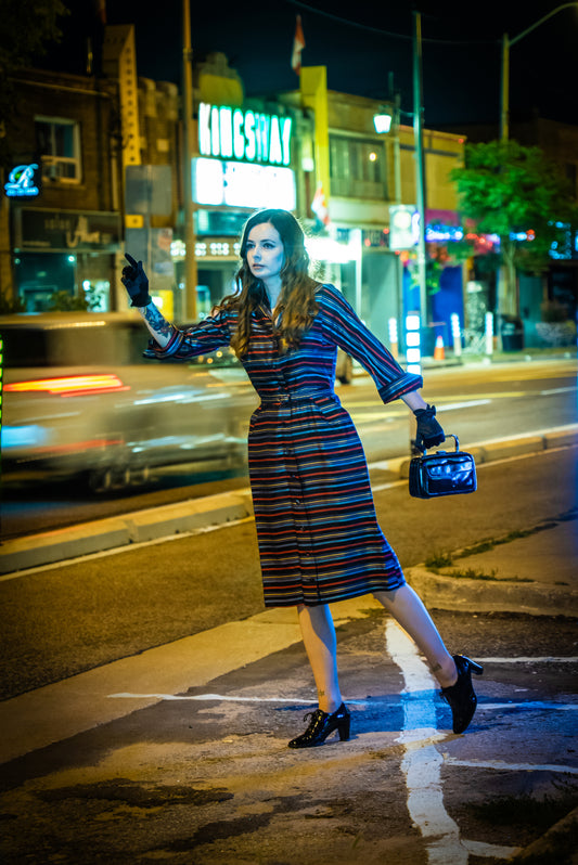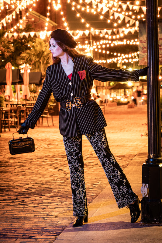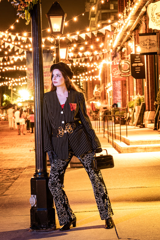 A collection inspired by the timeless allure of the Film Noir genre, which had its heyday in the 1940s and 50s. We drew inspiration from iconic female characters like Joan Crawford's Mildred Pierce and Lauren Bacall's Marie 'Slim' Browning from To Have and Have Not. Mystery, structured dramatic silhouettes and a moody atmosphere define this collection. Perfect for a night out at the jazz bar with a neat whiskey or Sidecar in hand, feelin' like a baddie!