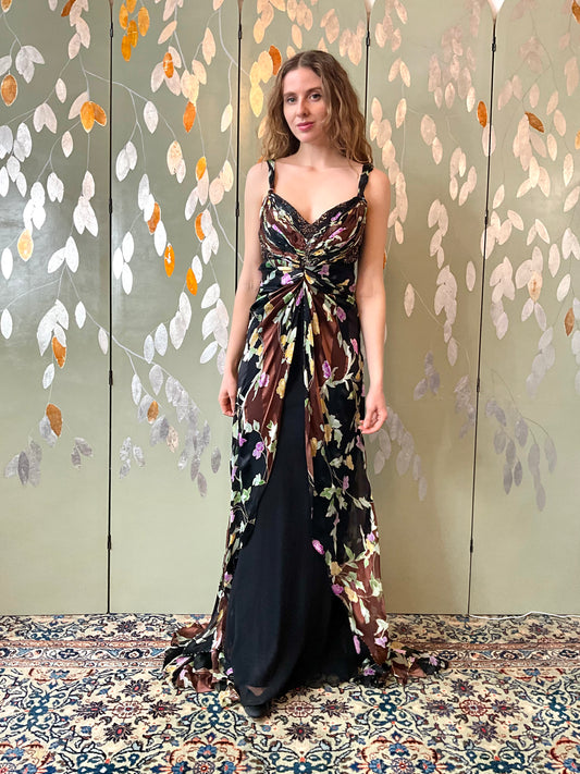 2000s Black/Brown Floral Silk Beaded Gown, Small