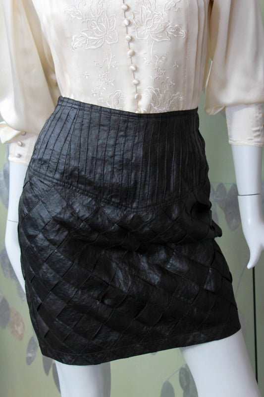 Vintage 1980s Black Silk Basket Weave Skirt and Jacket Set, Small