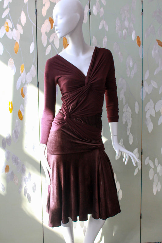 Donna Karan Brown Velvet Draped Fitted Midi Dress, XS