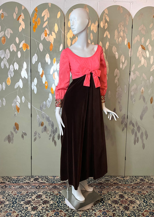 Vintage 1960s Pink Taffeta & Brown Velvet Empire Gown, Small