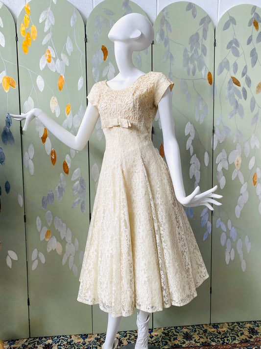 Vintage 1950s Cream Lace Cocktail Dress with Embellished Bodice, B34"
