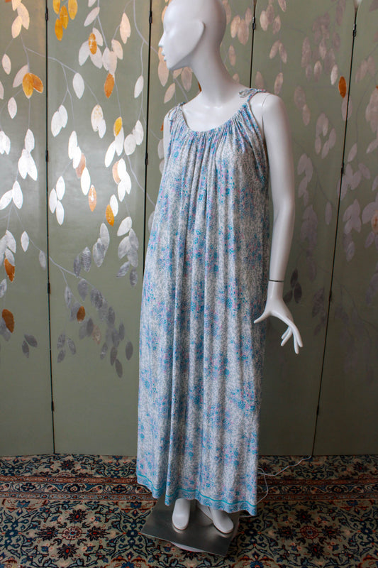 1970s Blue Floral Maxi House Dress with Tie Shoulders, Large