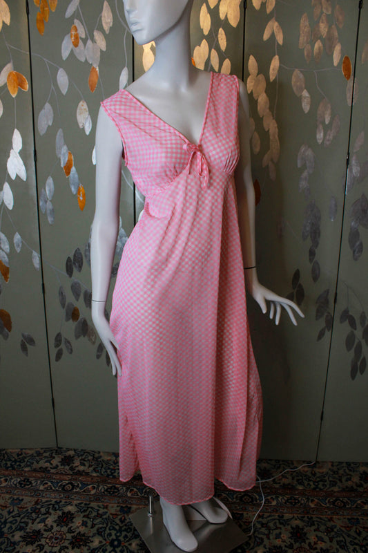 Vintage 1950s Pink Nightgown with Sheer Ribbed Lace Bodice and Self Belt, Small
