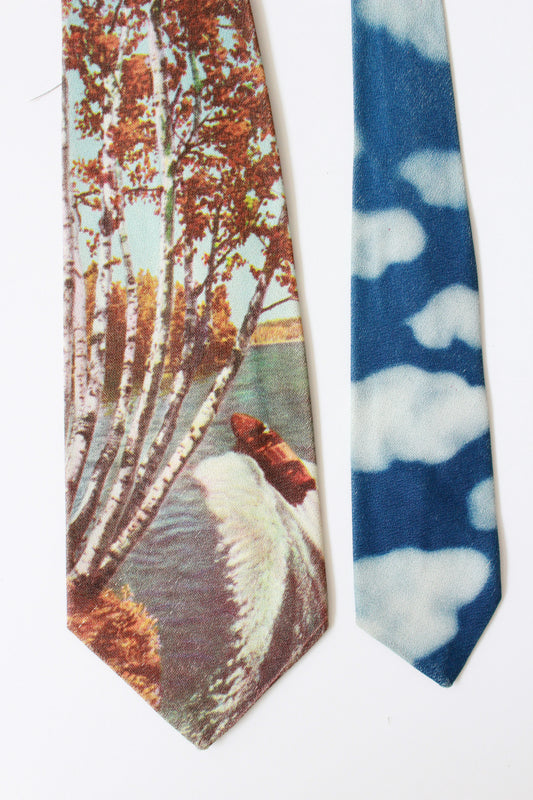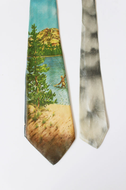 Vintage 1950s Water Fishing Photo Print Rayon Tie, Mid Century