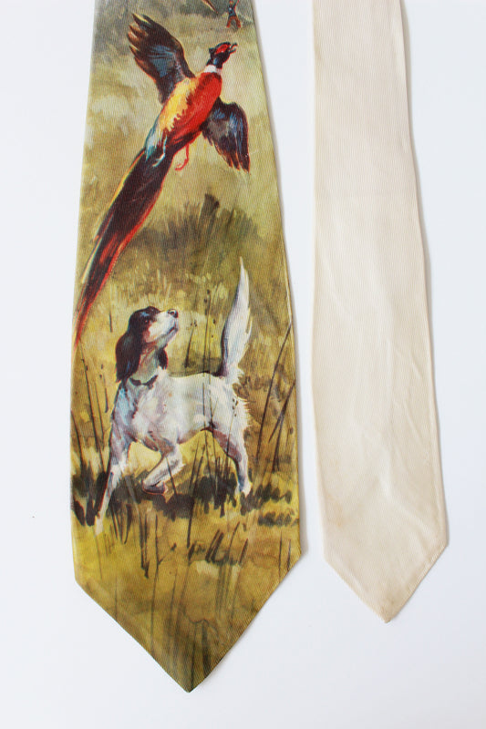 Vintage 1950s Photo Print Rayon Tie With Dog And Pheasant, Mid Century