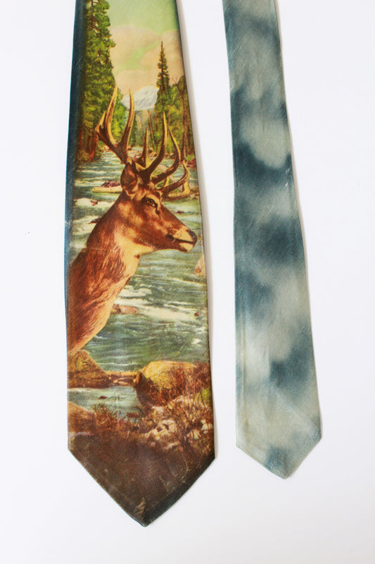 Vintage 1950s Photo Print Tie With Orange Deer, Rayon Mid Century