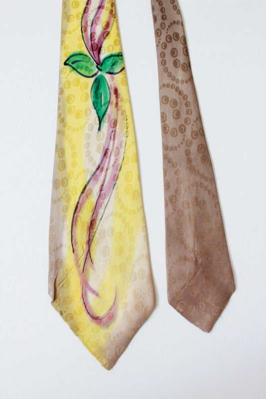 Vintage 1950s Silk Hand Painted Yellow And Taupe Tie