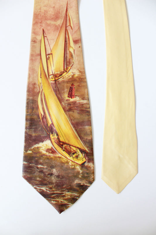 Vintage 1950s Photo Print Tie With Yellow Ships in Rayon, Mid Century