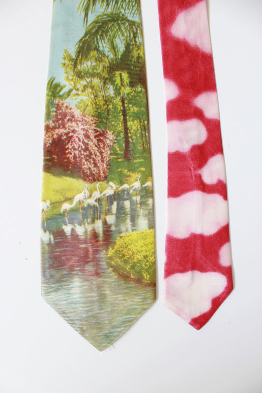 Vintage 1950s Pink Flamingo Rayon Photo Print Tie, Handmade Mid Century
