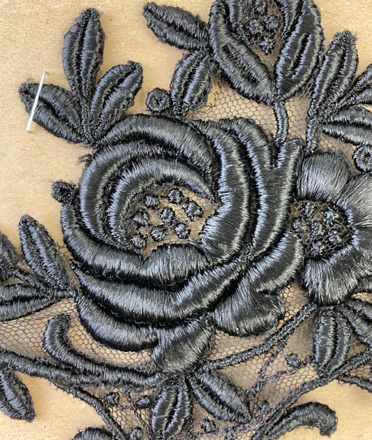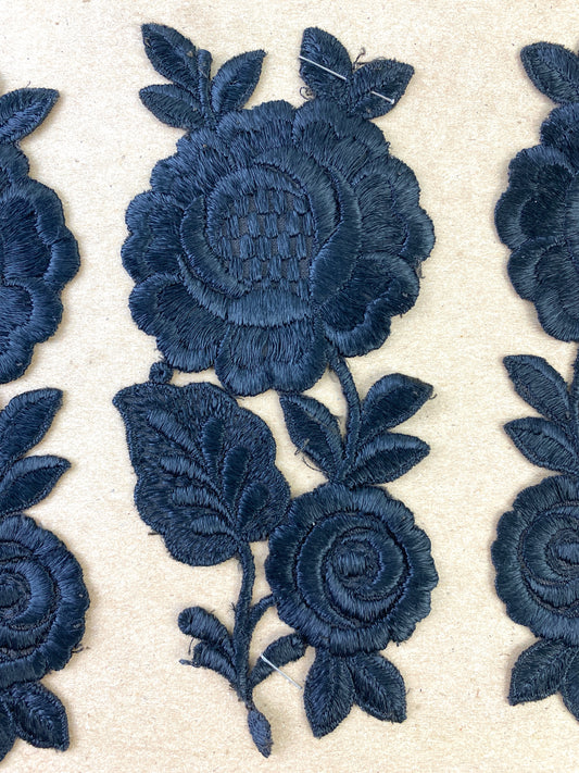Antique Victorian Black Silk Floral Embroidered Appliqués, 4 Pieces
