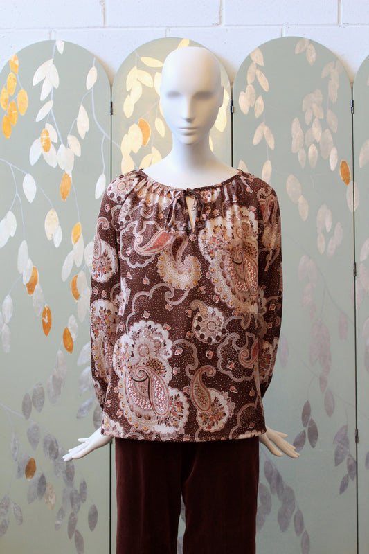 1970s Brown and Blush Paisley Print Long Sleeve Peasant Top, Medium