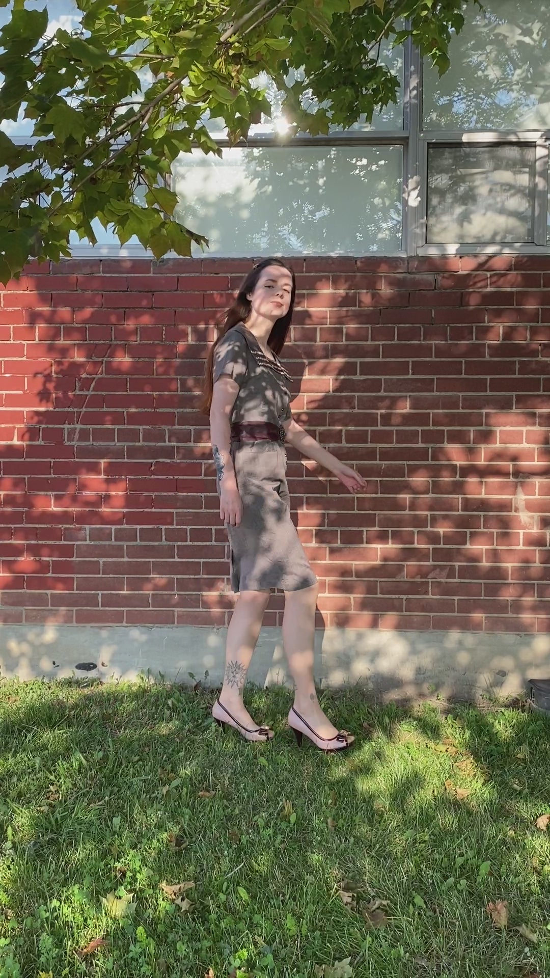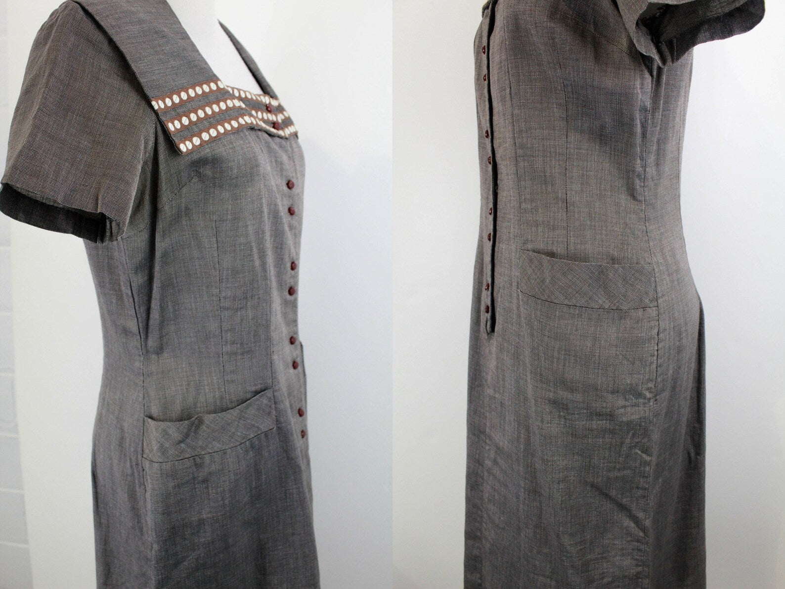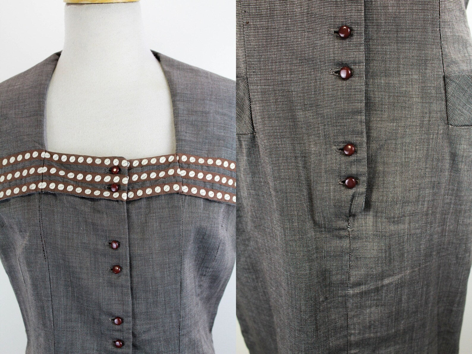 What a lovely find! This 50s button front dress is a perfect fall day dress. It features uniquely spaced burgundy buttons, in sections of 2. The neckline is square, and features a flat, squared collar that has contrasting white embroidered dots along taupe stripes across the top of the bust. The dress is form fitting, with short sleeves, two front welt pockets, and a slit at centre back.
