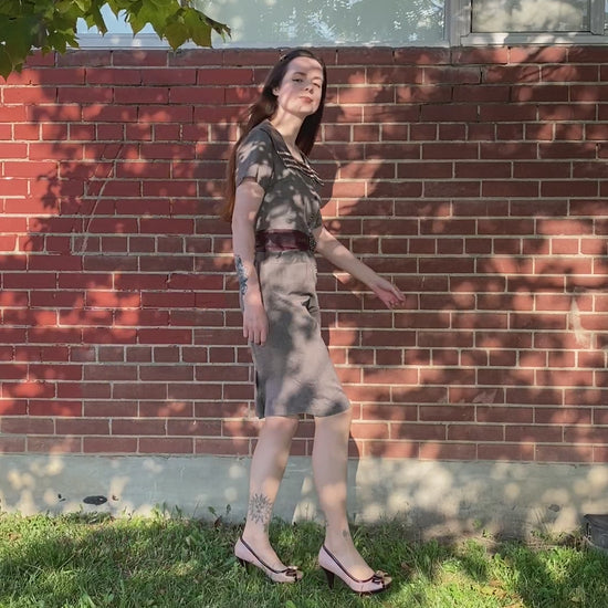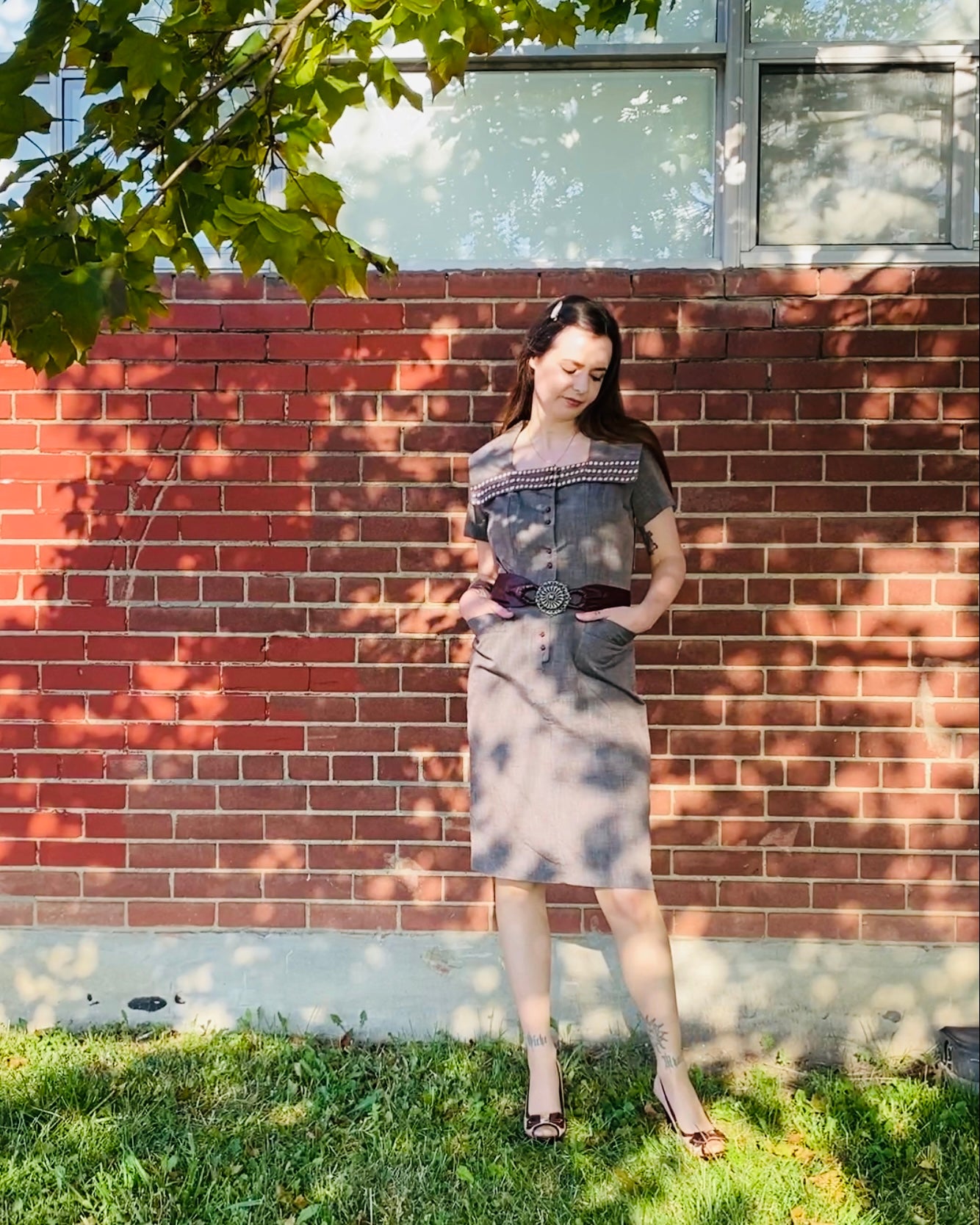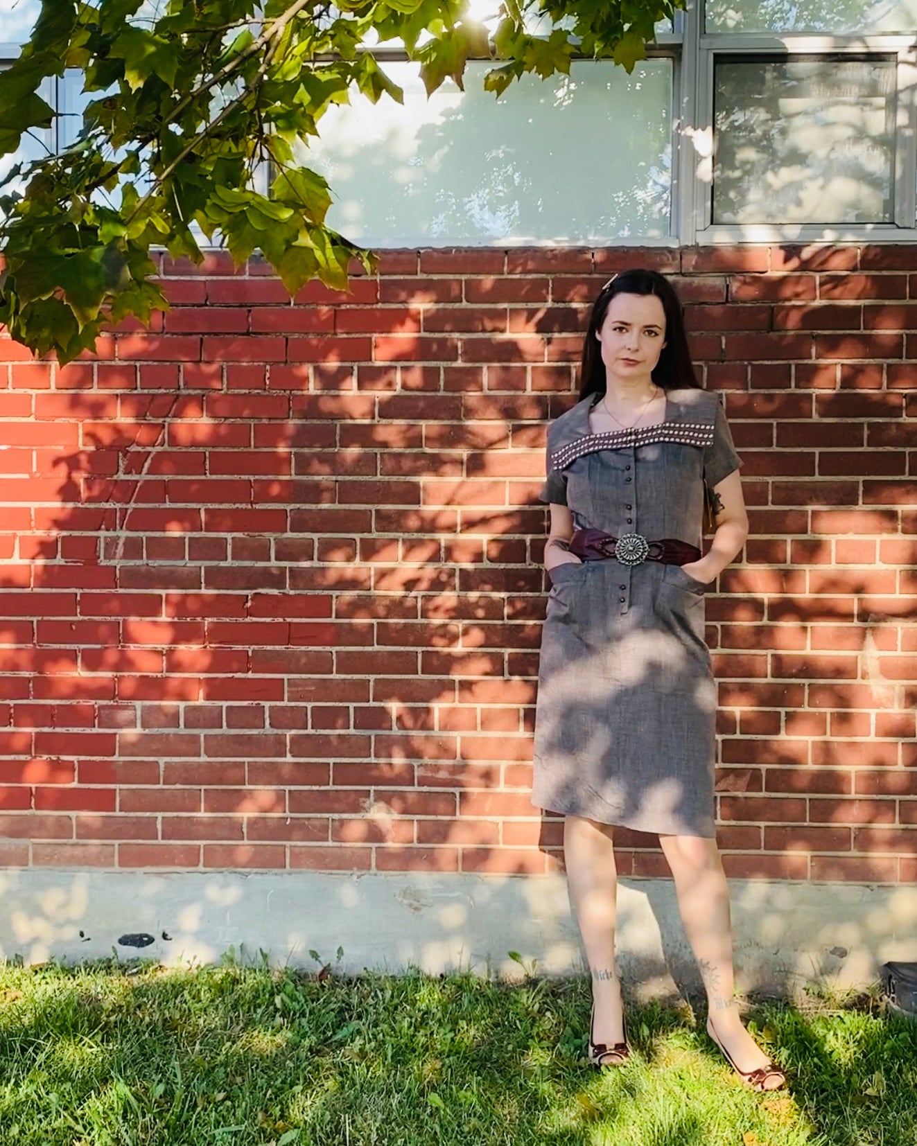 What a lovely find! This 50s button front dress is a perfect fall day dress. It features uniquely spaced burgundy buttons, in sections of 2. The neckline is square, and features a flat, squared collar that has contrasting white embroidered dots along taupe stripes across the top of the bust. The dress is form fitting, with short sleeves, two front welt pockets, and a slit at centre back.