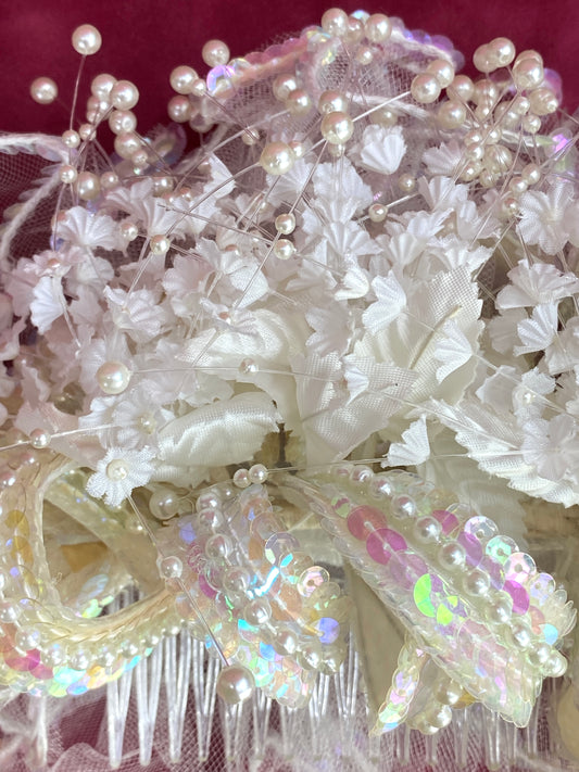 Vintage 80s/ 90s Sequin, Flower & Tulle Bridal Hair Comb