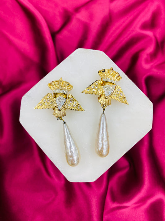 Vintage Butler & Wilson Gold Crown, Eagle Wings, Pearl Drop Clip-On Earrings