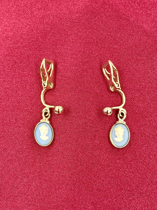 Vintage Clip-On Blue Dangling Cameo Earrings