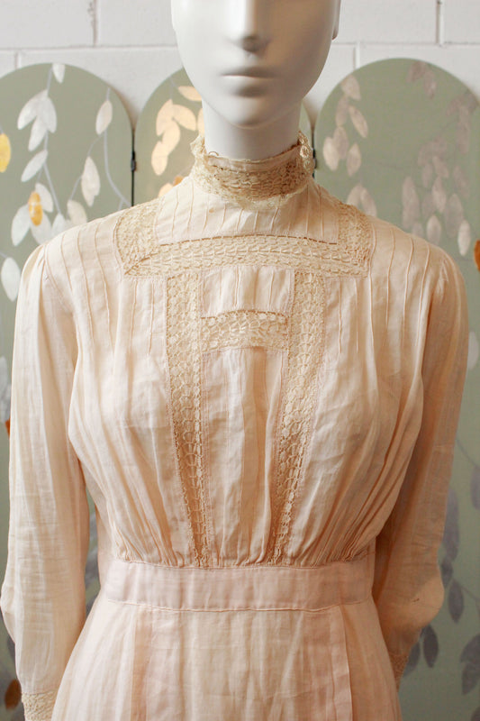 Antique Edwardian Day Dress, Soft blush, Summer Dress, Cotton Vintage Dress, Boho Wedding Dress, Lace and Embroidery Small-XS