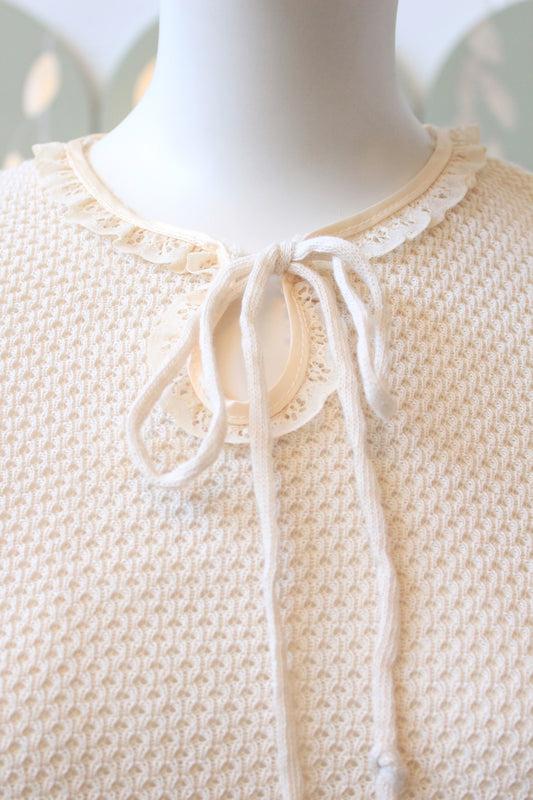 1980s Ultra Feminine Deadstock Short Sleeve Cream Knit Top With Lace Trim And Bow, Small