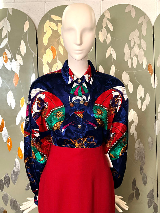 Vintage 1980s Blue and Red Satin Print Long Sleeve Button Up Shirt, L-XL