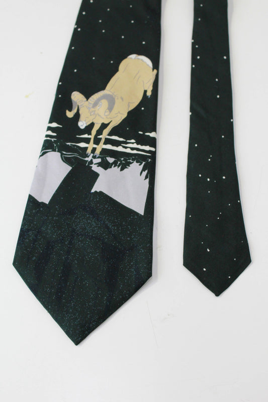 1970s Ram/Jumping Goat Print Necktie, Silk Roland Tie, Dark Green